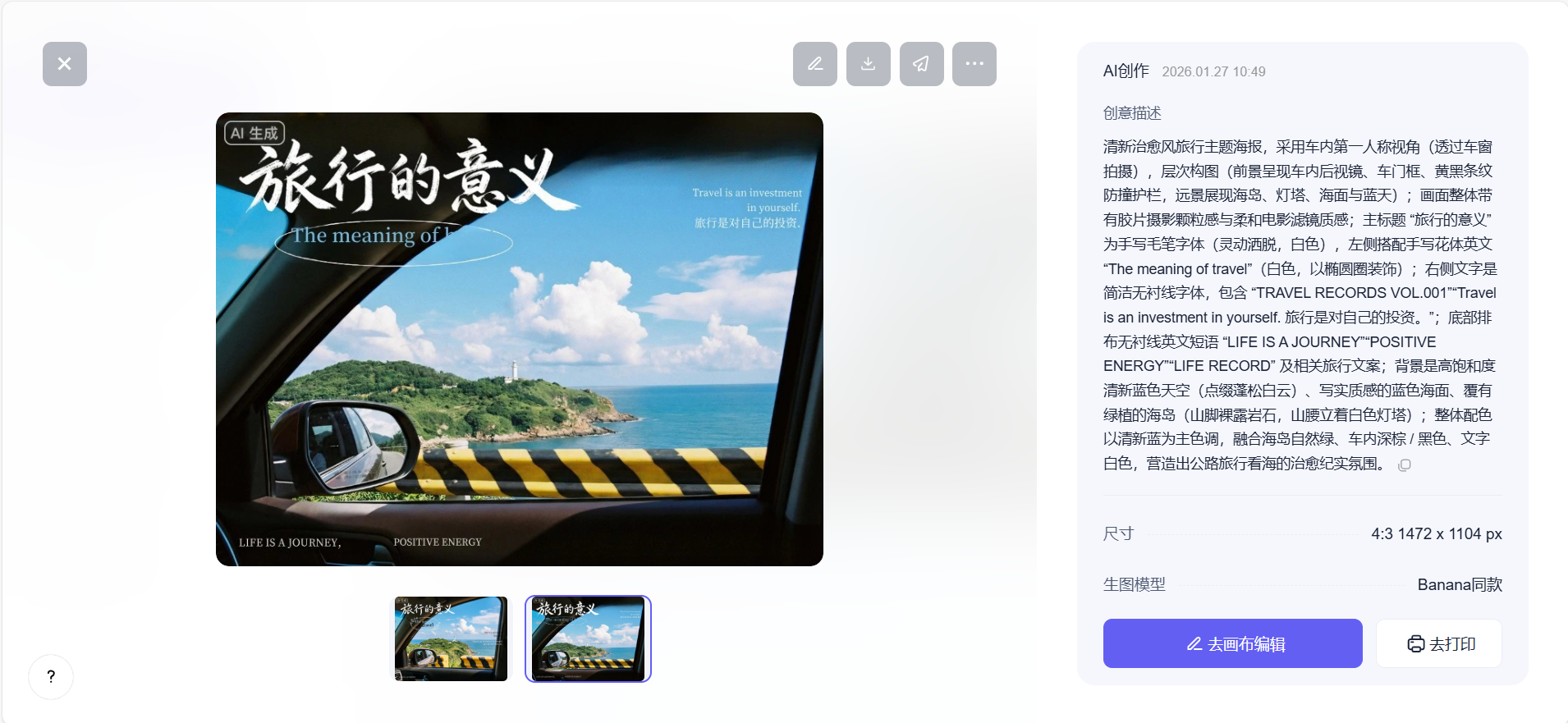 点击蓝色按钮“去画布编辑”,就可以直接跳转到在线编辑器内继续修改设计。