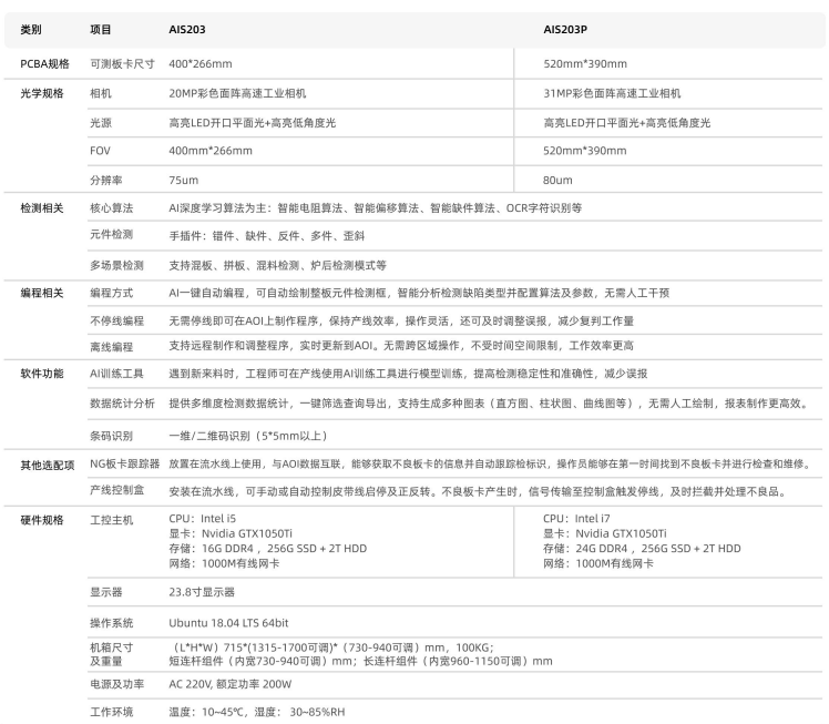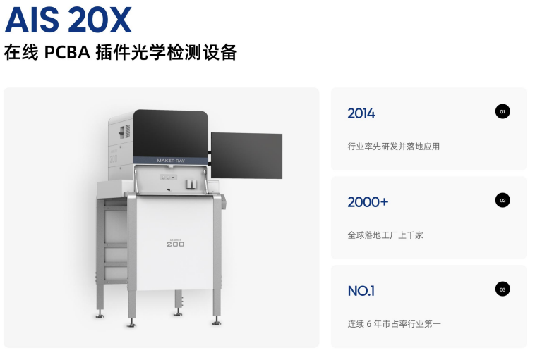 从图片信息可见,AIS 20X 系列即属于典型的 在线式 PCBA 插件光学检测设备,主要部署于插件完成后的产线节点。