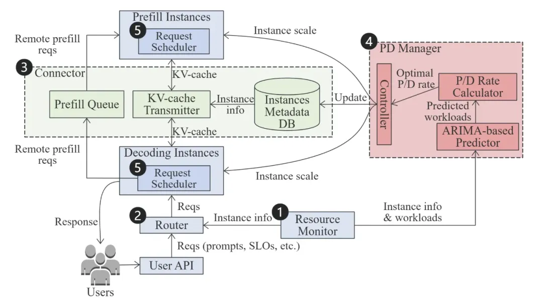 DOPD论文中,设计了一种动态最优PD分离调节系统,主要包括五个组件:资源监控器、请求路由器、KV通信连接器、P&D实例管理器和请求调度器。该系统架构图如下: