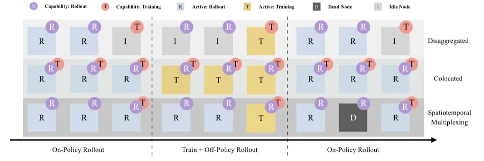 我们知道,强化学习训练使用的数据集是由模型推理产生,或模型推理产生+人工标注产生。如果把训练任务和生成数据集的推理任务部署在同一集群上,自然部署难度和调度难度都是比较低的,但会存在以下几个问题: