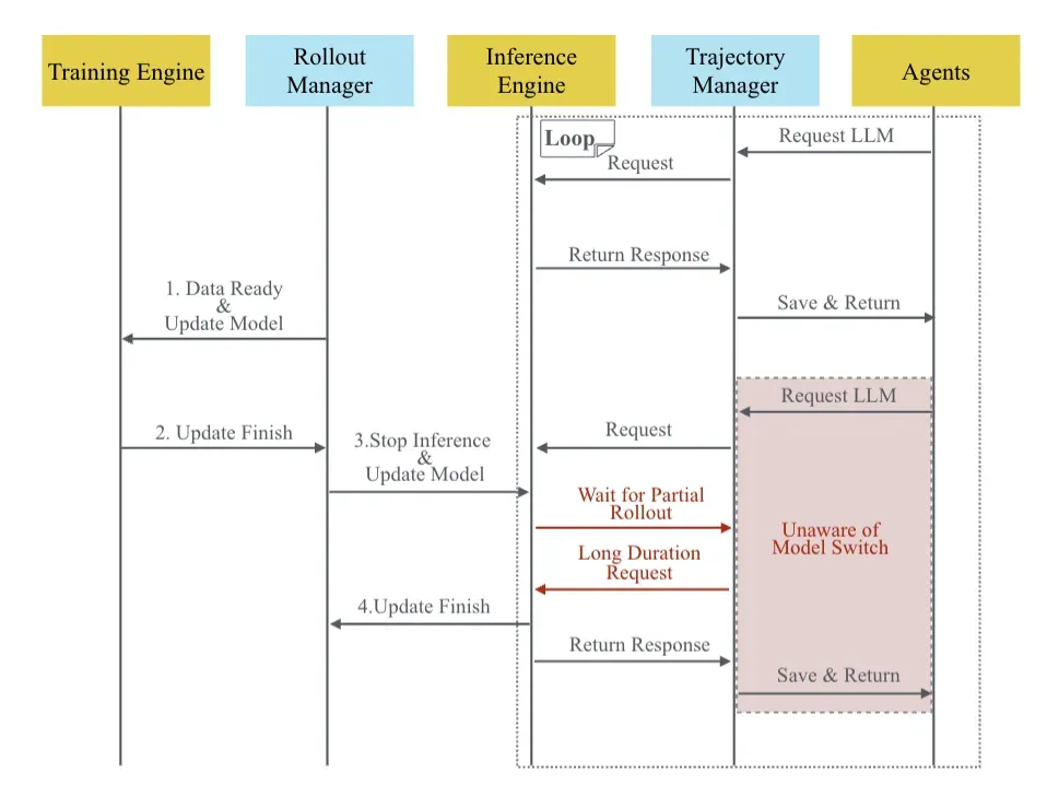 针对训推分离架构的第一个问题,SeamlessFlow论文中设计了一个在推理生成阶段中,介于Agent和LLM之间的数据交互平面,其核心是一个“轨迹管理器”,即把agent调用llm的全过程,以及全部的输入输出全部精准记录,从而保障一致性,同时这个过程对Agent完全透明。数据交互平面的示意图如下: