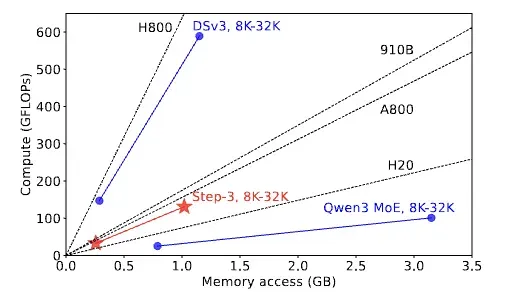 Step-3论文中提出了一个“算术强度”的概念,即和显存交互平均每个字节所需要运算的次数,“算术强度”和ATTN模块的设计有关,和batch size、上下文长度这些参数都无关,同时,GPU硬件的算力和显存带宽也是固定的,因此硬件的算力-带宽比(roofline)也是固定的。因此,当模型的“算术强度”高于硬件的“roofline”时,那么硬件的算力成为瓶颈,反之则内存带宽成为瓶颈。在设计的模型的ATTN模块时,”算术强度“应尽可能接近主流硬件的“roofline”,则整体效率较优。如下图所示,step3的设计,“算术强度”是接近A800或昇腾910B的。