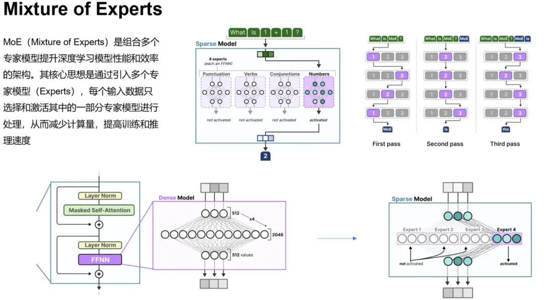 - 混合专家模型 MoE:由门控网络+若干个专家模型组成,门控网络负责选择适合某类问题的专家模型进行激活并处理请求,不同的专家模型擅长处理不同领域的问题,单一请求一般只激活少部分专家进行处理,即稀疏激活特性。