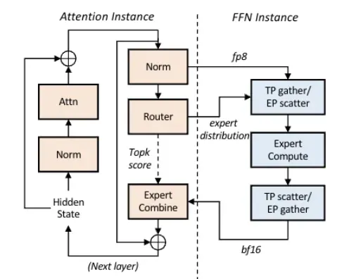 由于预填充和解码两个阶段对资源需求显著不同,前文已经介绍了PD分离相关内容。那么是否可以将单一阶段展开分析,来尝试进一步优化。注意到基于Attention的LLM模型通常由注意力模块和前馈网络模块组成,解码阶段中,注意力模块的参数量少但需要大量KV交互,是访存密集型的,而前馈网络模块参数量大,是计算密集型的,因此Step-3模型论文提出了AFD(Attention - FFN Disaggregation)架构,即将注意力模块和前馈网络模块部署在不同的设备上,在PD分离的基础上进一步优化资源的利用率和推理服务效率。下图为AFD的架构图: