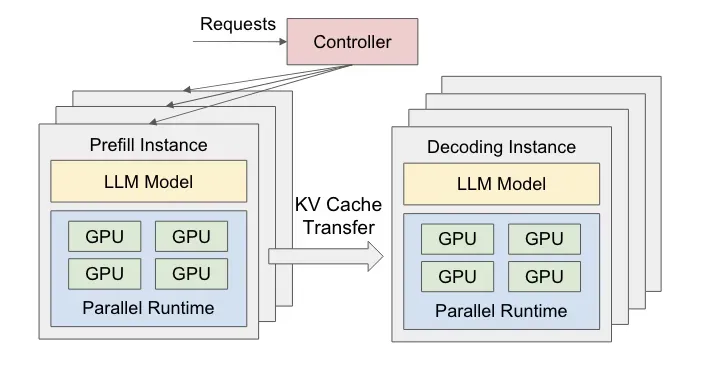 Prefill和Decode阶段间KV cache的传输:在具备IB(或Roce)网络的环境下,把P、D两个阶段分别部署在不同的设备上,或在一个设备内把P、D两个阶段分别部署在不同的GPU上,这样就规避了前文中提到的不同阶段强干扰和并行策略耦合的问题,具备了独立优化TTFT和TPOT的可行性。下图为P、D分离部署的逻辑架构图: