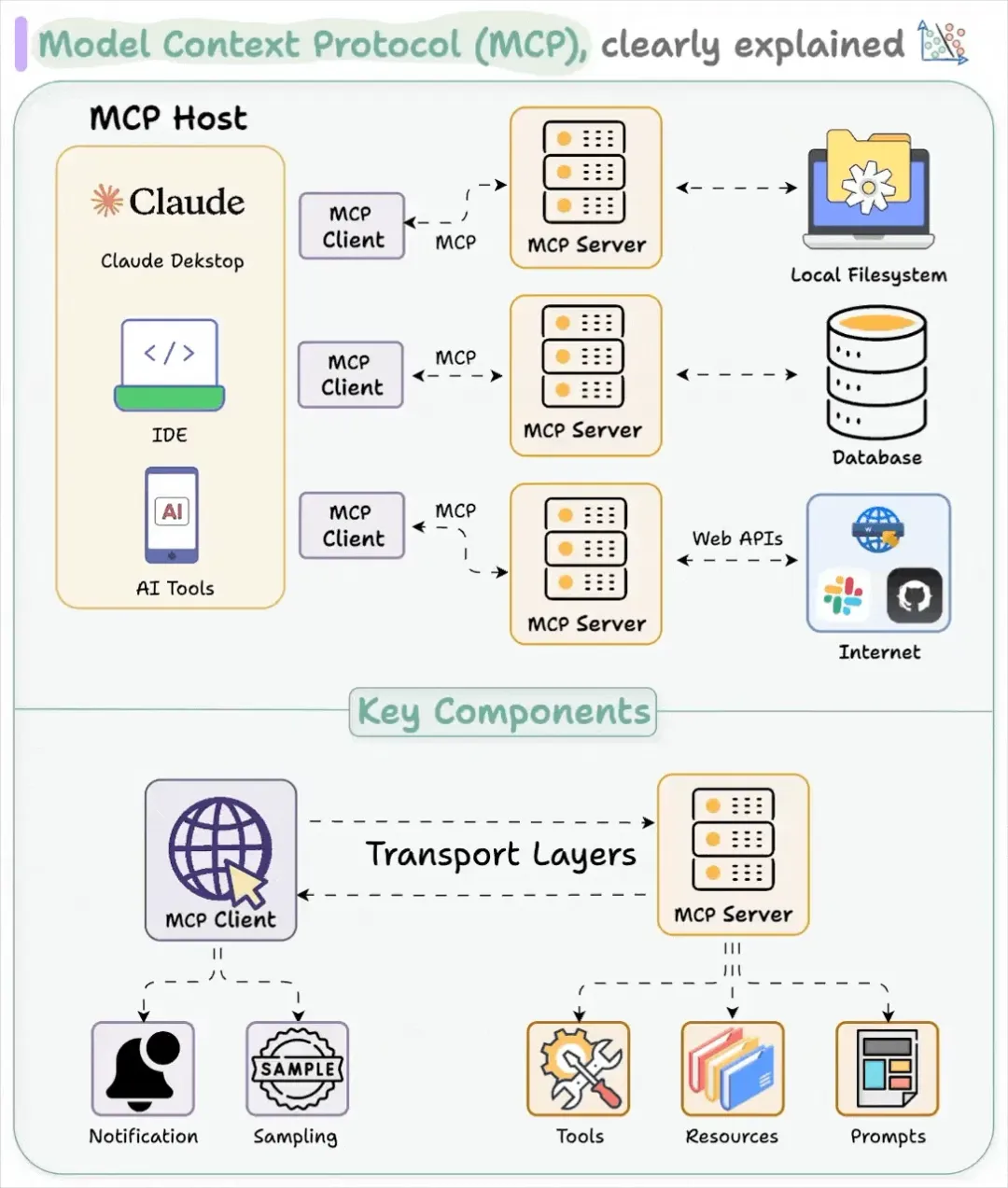 - MCP Host:发起请求的应用程序(如Claude Desktop或IDE),运行在用户设备上