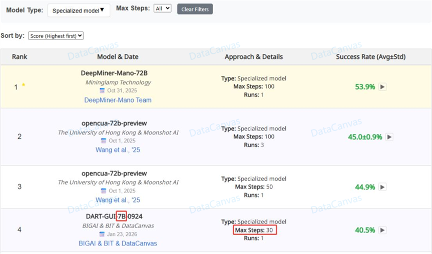 2026 年 1 月,在操作智能领域权威评测体系 OSWorld 发布的最新榜单中,九章云极 DataCanvas 凭借在 Alaya NeW Cloud 强化学习平台上训练的 DART-GUI-7B 模型,以卓越的智能操控表现,一举夺得 OSWorld 7B 赛道冠军!