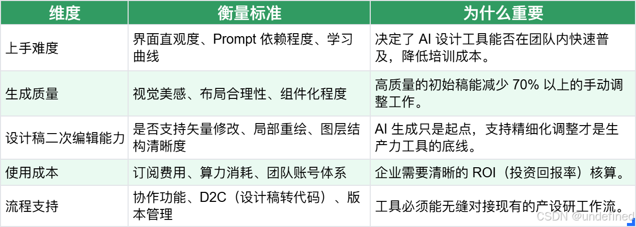 评估工具时,别光盯着宣传片里的效果图看。作为 AI 设计工具的服务使用方,你得关注下面这 5 个维度,包括上手难度、设计稿生成质量、设计稿二次编辑能力、使用成本、流程支持。