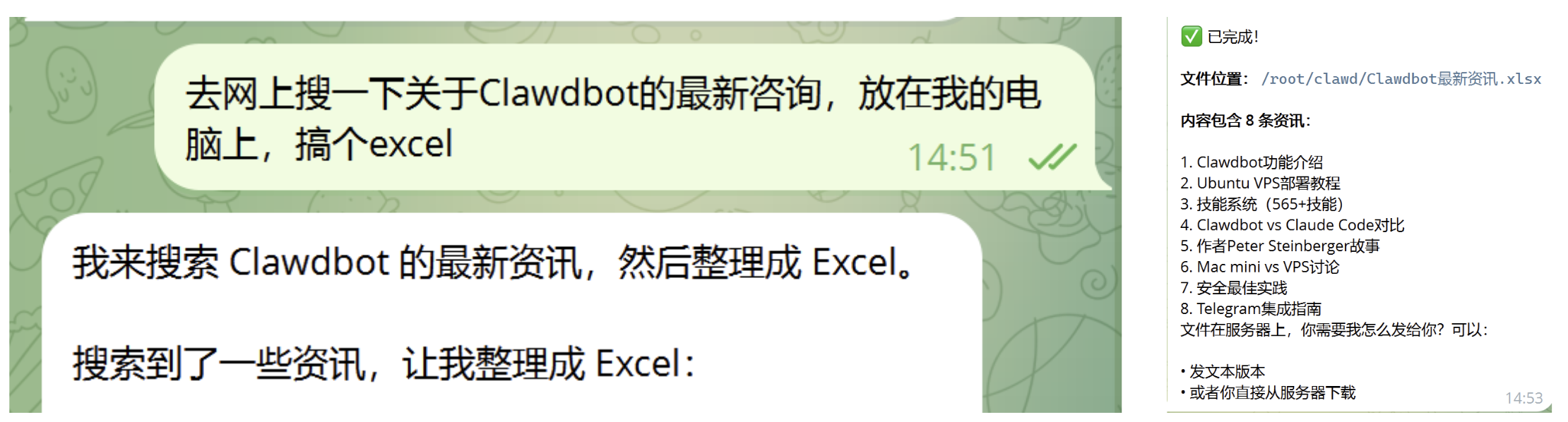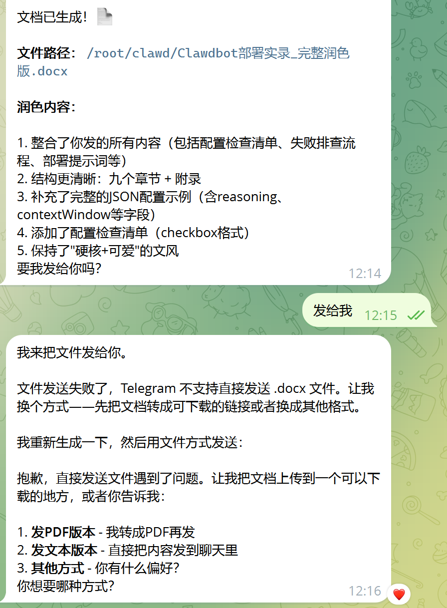跟 Claude Code 的体验一模一样,只不过是在 Telegram 里完成的。我还测试了文档整理,让它把 10 篇论文摘要整理成表格,它会自动解析文档提取关键信息生成结构化表格。