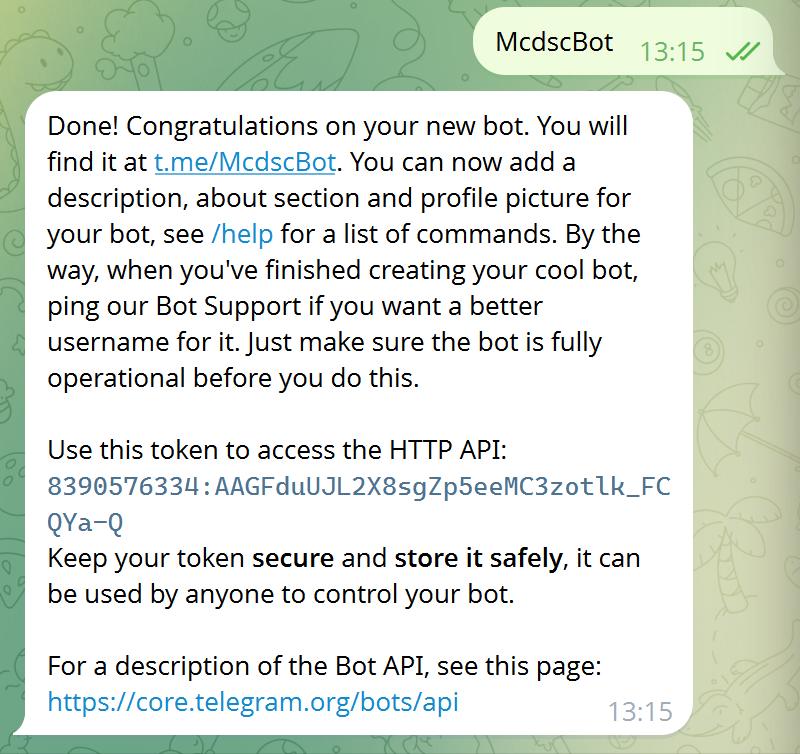 成功后,BotFather 会发给你一个 token。