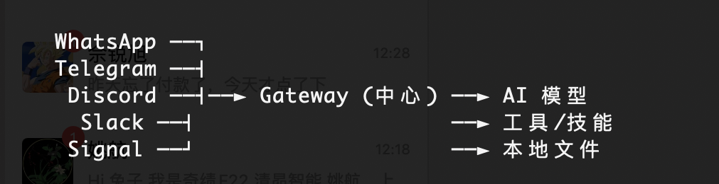 支持几乎所有主流通讯平台:WhatsApp、Telegram、Slack、Discord 、Google Chat、Signal、iMessage 、Microsoft Teams、Matrix、Zalo、WebChat。