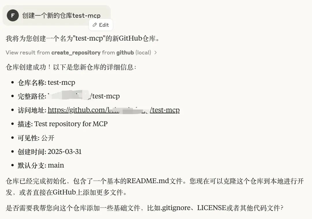 从图上可以看到,通过创建仓库 test-mcp 这样的提示词,Claude 的大模型自行判断需要使用 mcp 中提供的 create_repository 能力,从而完成了仓库的创建,接下来我们打开 Github 也确实发现了这个已经创建的仓库。