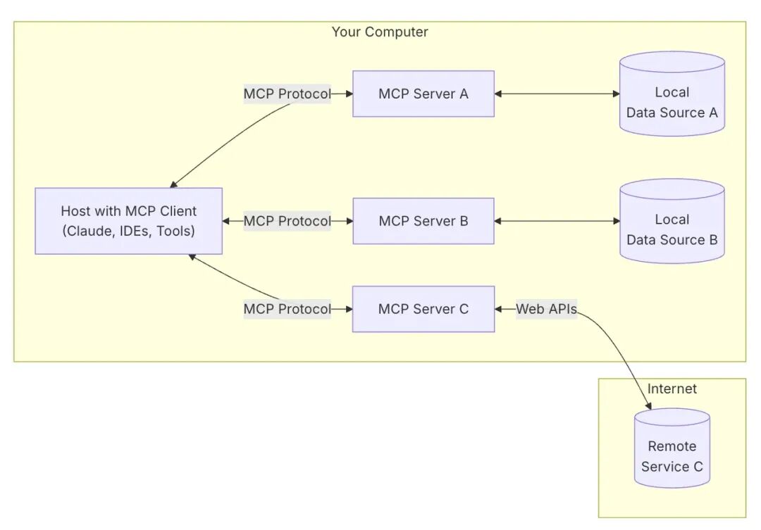 整体的工作流程是这样的:AI 应用中集成 MCP 客户端,通过 MCP 协议向 MCP 服务端发起请求,MCP 服务端可以连接本地/远程的数据源,或者通过 API 访问其他服务,从而完成数据的获取,返回给 AI 应用去使用。
