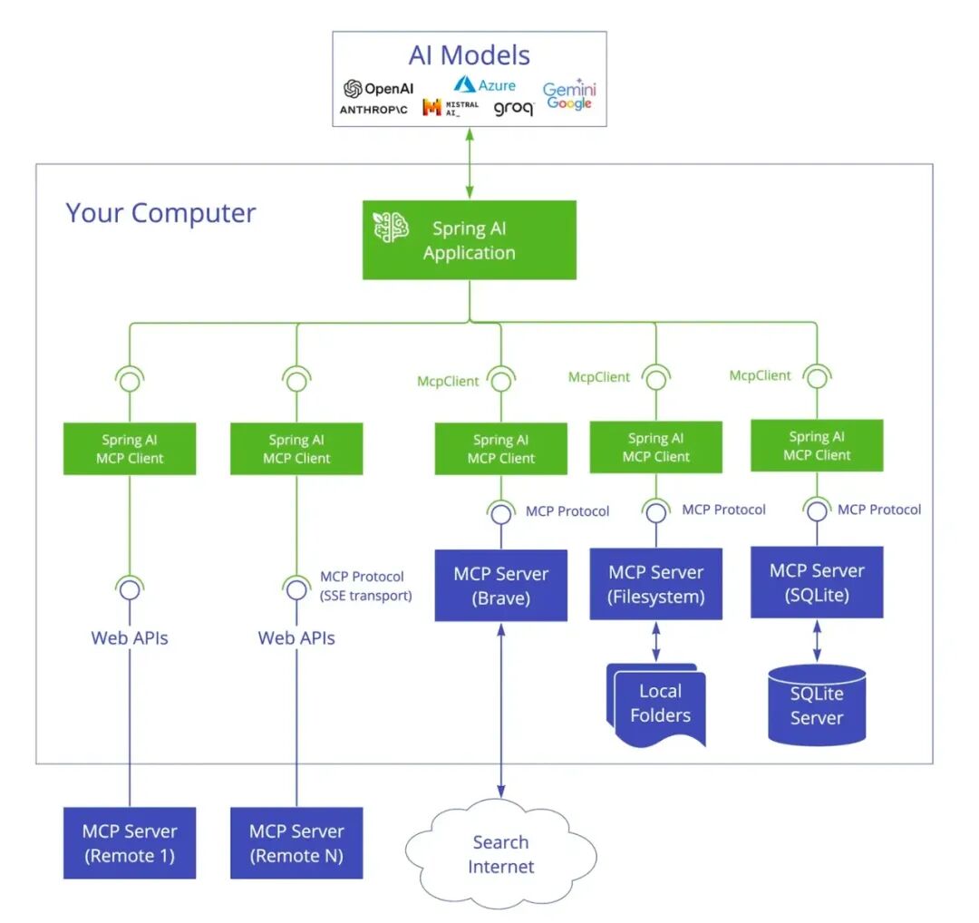 - Spring AI 应用程序:使用 Spring AI 框架构建想要通过 MCP 访问数据的生成式 AI 应用程序