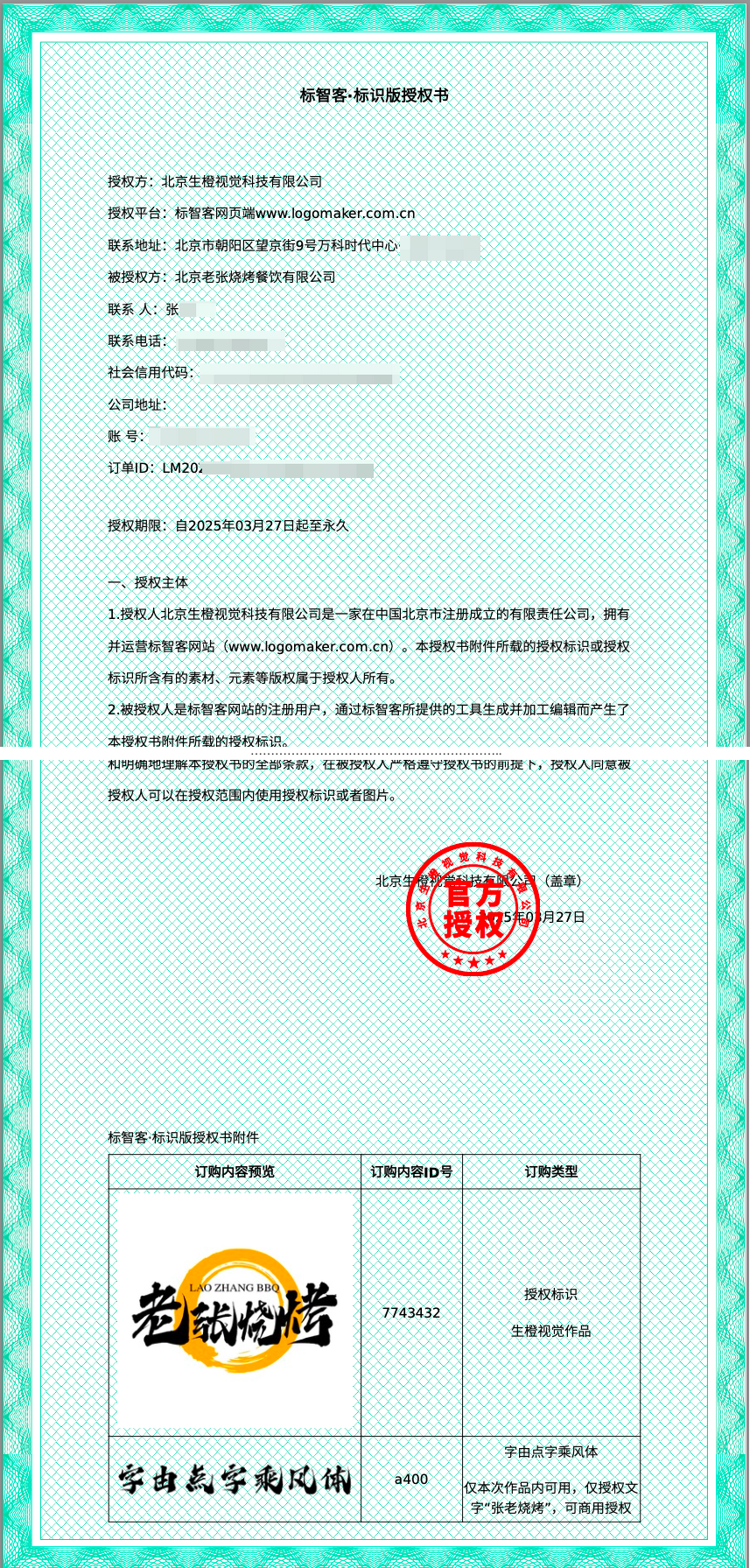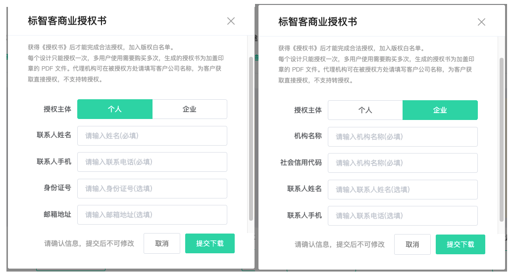 授权书就是版权声明,是标智客给你发放的一个商业授权书,最好下载一份保存好,关键时候有大用。授权书支持授权给个人或企业。