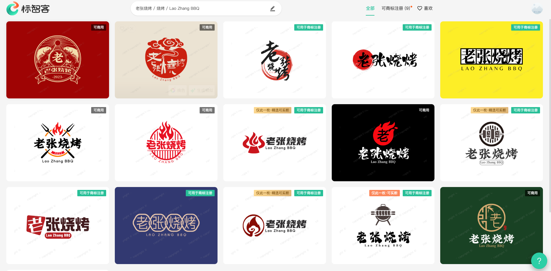 高效筛选与预览修改:生成的Logo可以通过“全部”、“可商标注册”、“喜欢”等分类进行筛选,方便用户快速找到符合自己需求的设计。在预览环节,用户可以进行大图预览、查看Logo效果图以及全套VI设计。并且可以对Logo进行快速调整,包括调整排版、颜色和文字内容等。更值得一提的是,标智客还提供了高级编辑功能,用户可以在在线编辑器中对字体、图表、素材、背景等进行随意修改,实现个性化的设计需求。