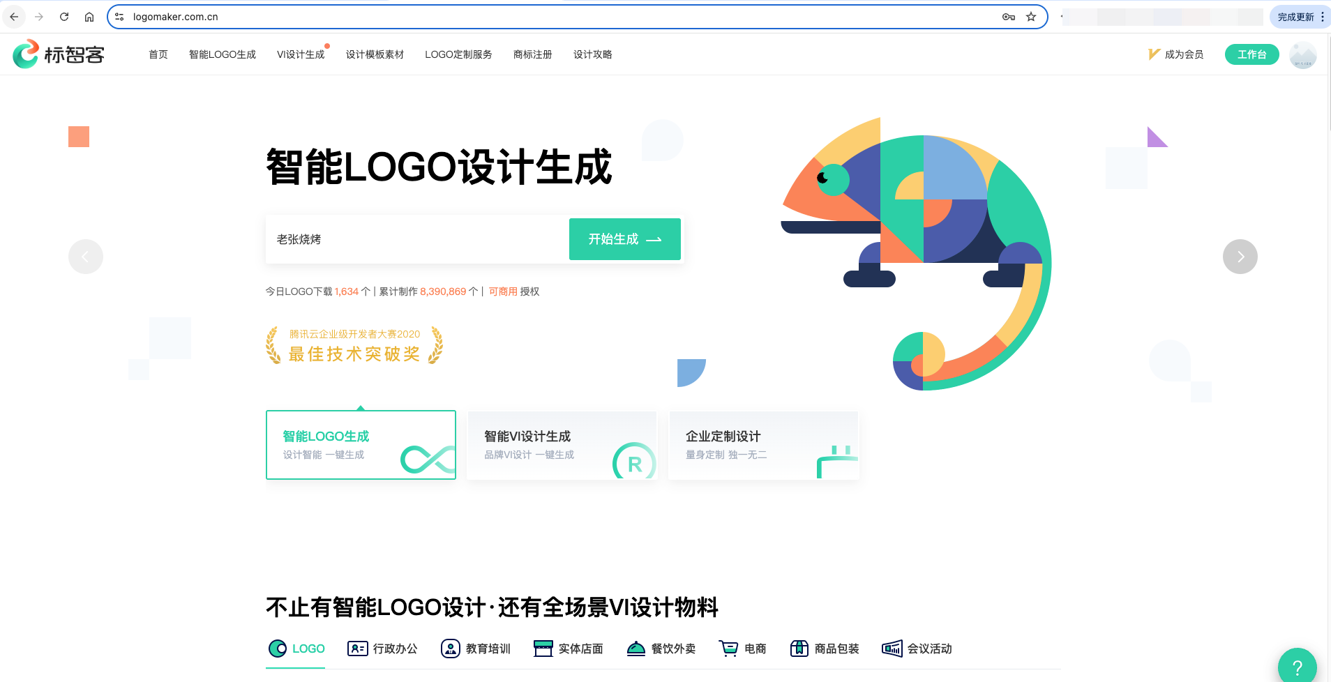 用电脑浏览器打开标智客网站,在首页的输入框里输入品牌名称“老张烧烤”,点击按钮“开始生成”即可。如下图: