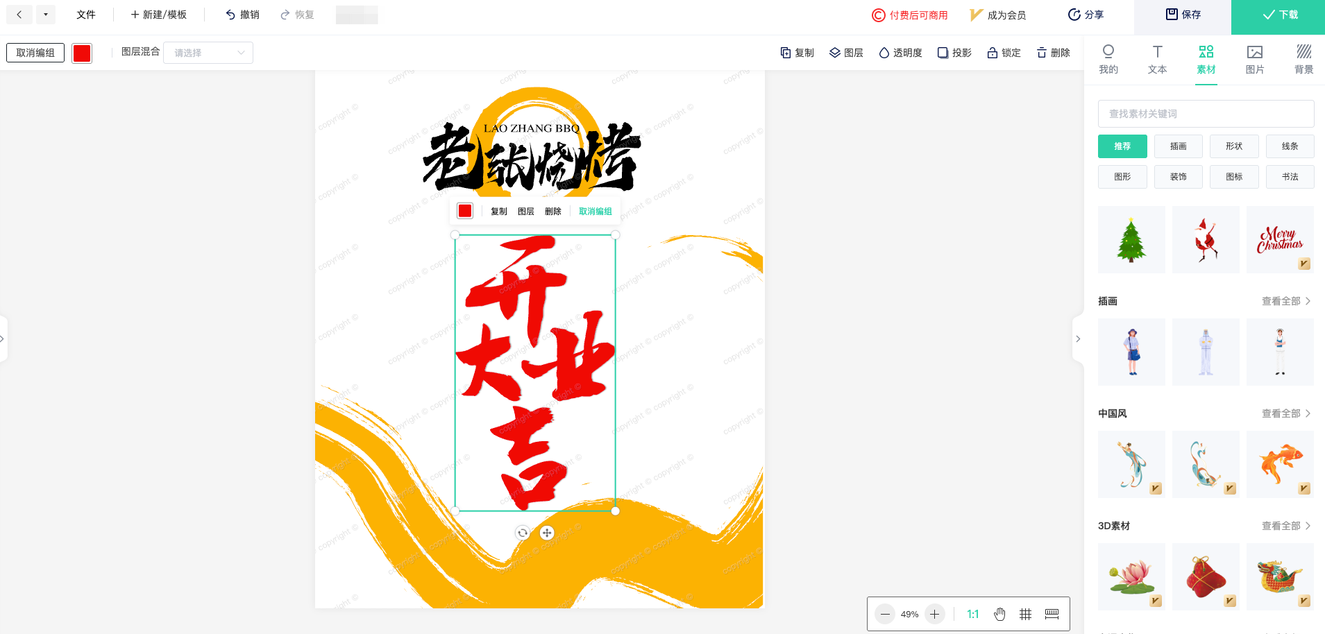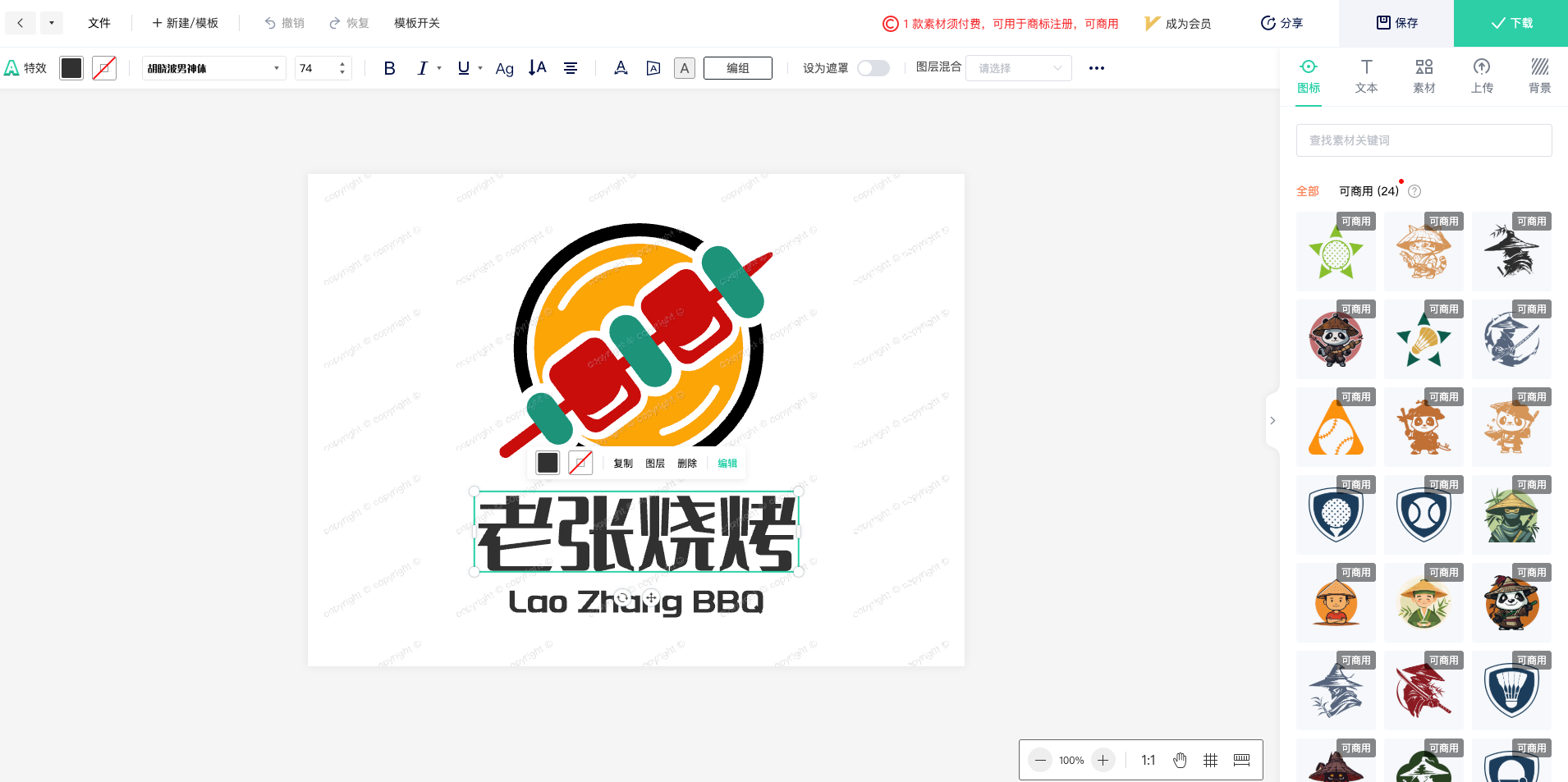 高级编辑功能:除了基本的修改功能外,标智客还提供了强大的高级编辑功能。用户可以使用在线编辑器中对字体、图表、素材、背景等进行随意修改,实现个性化的设计需求。如下图: