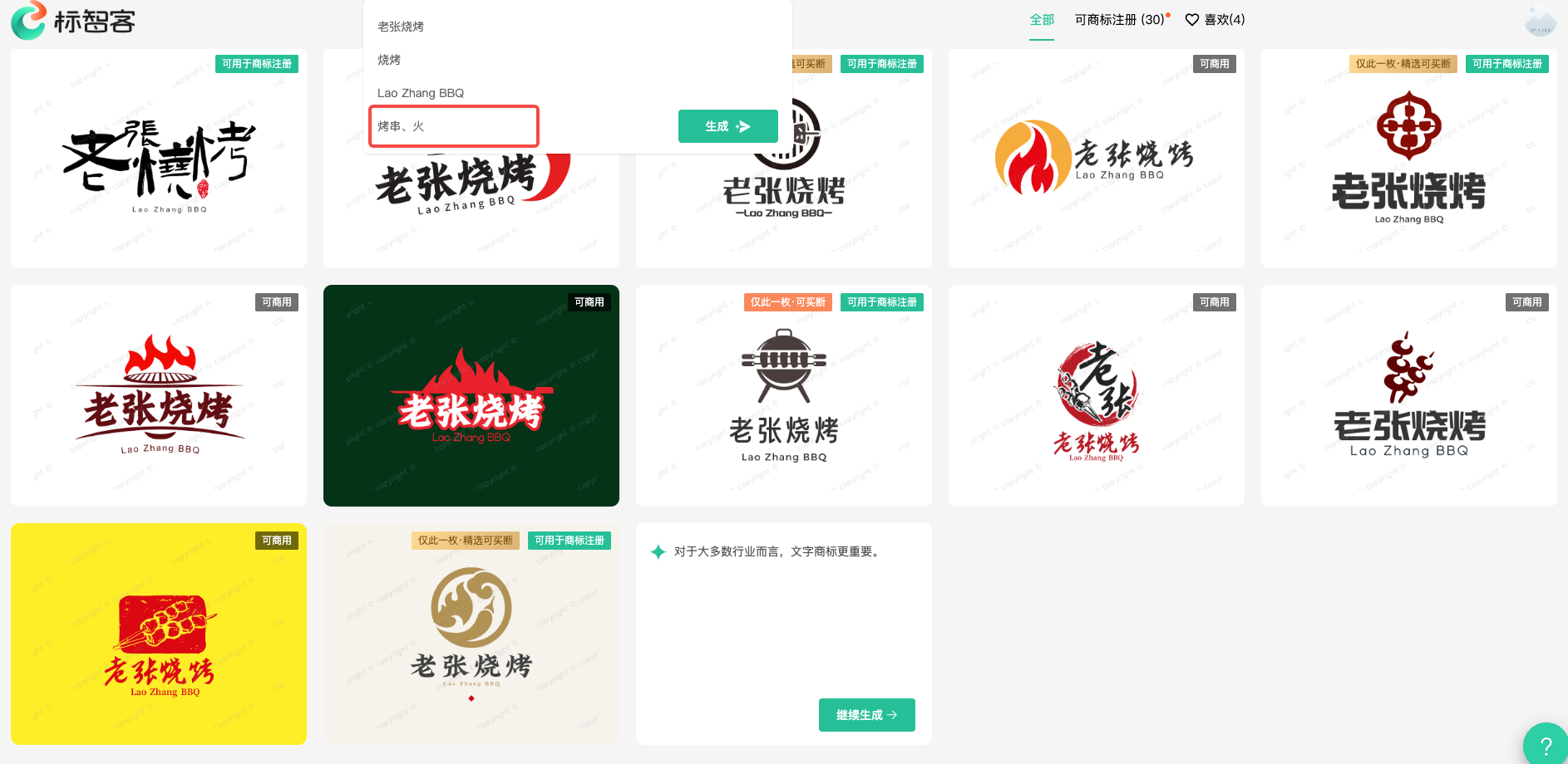 下图就是初始的生成效果,还是不错的,如果没有特别满意的点击“继续生成”按钮生成更多的Logo,标智客可以无限生成Logo,我测试时尝试生成了几百个都没有什么重复的。如下图: