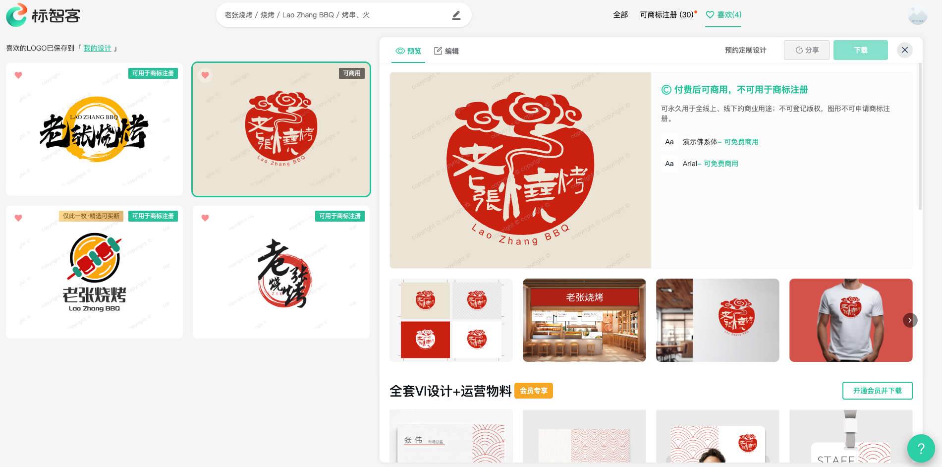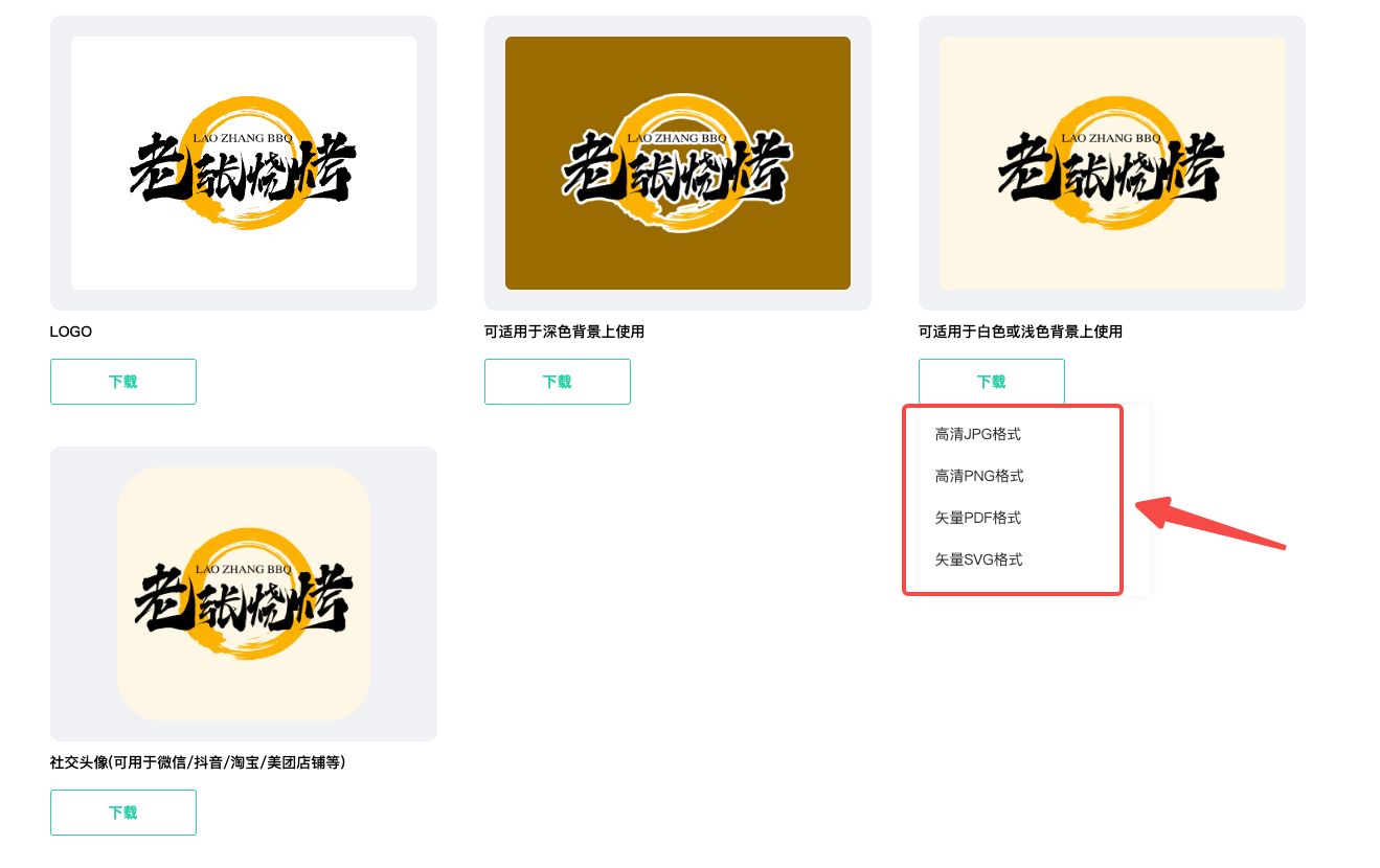 在标智客平台设计并选定心仪的Logo后,接下来就可以将其下载保存,方便后续使用。以下为您详细介绍可供下载的内容。如下图: