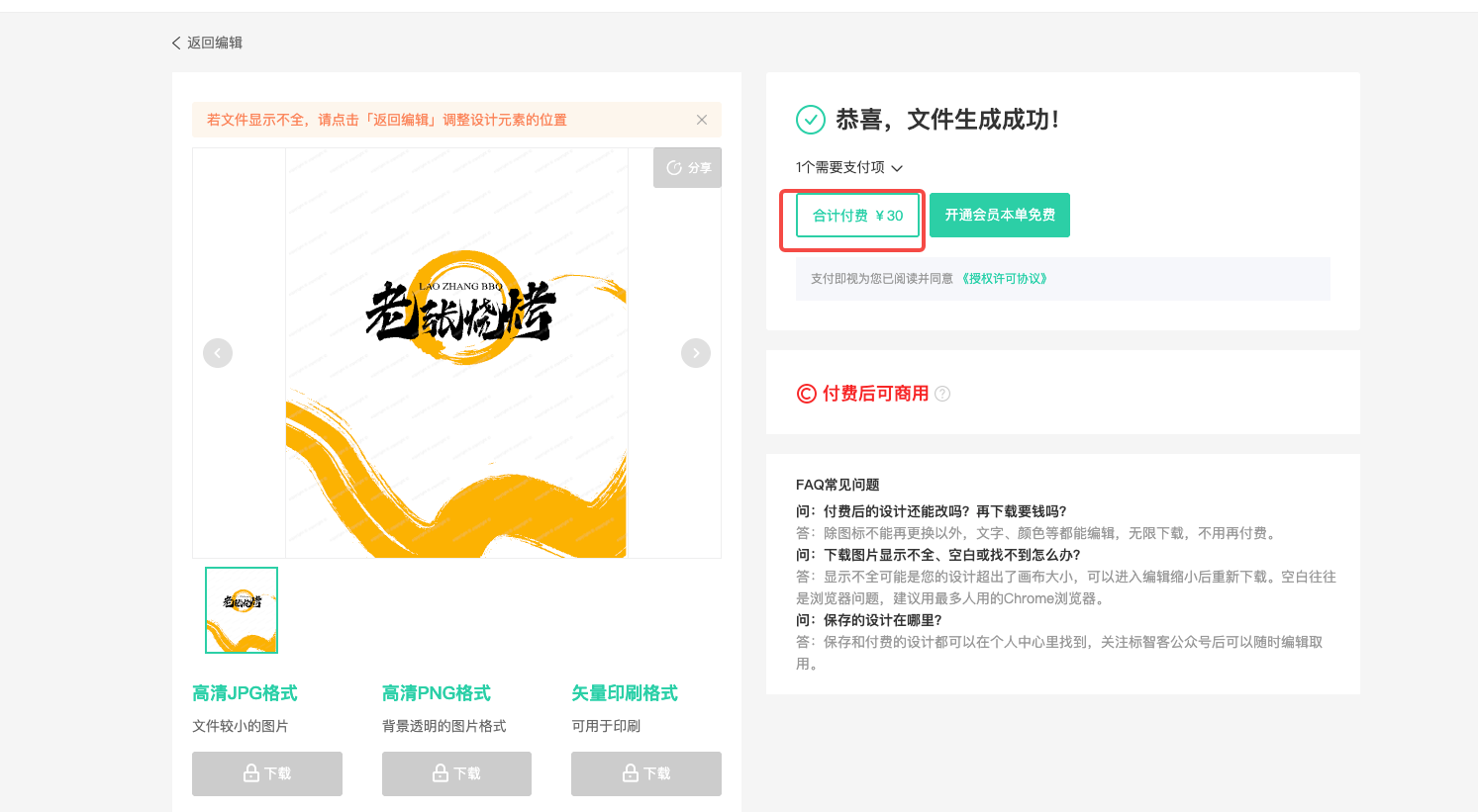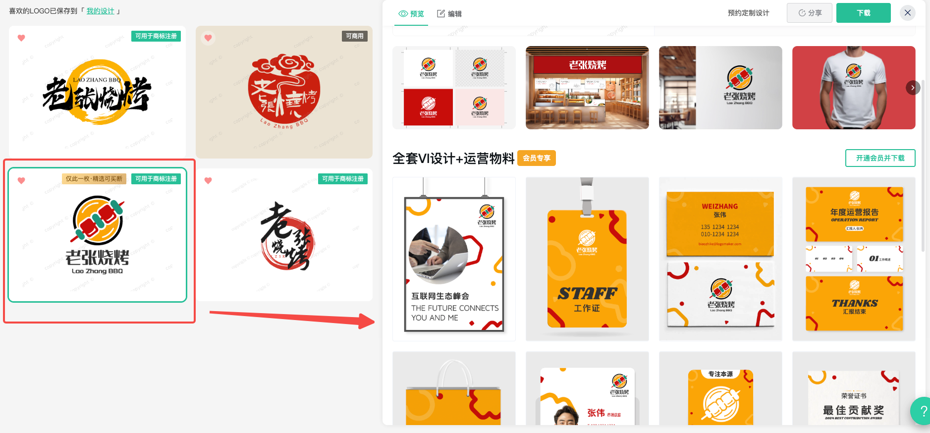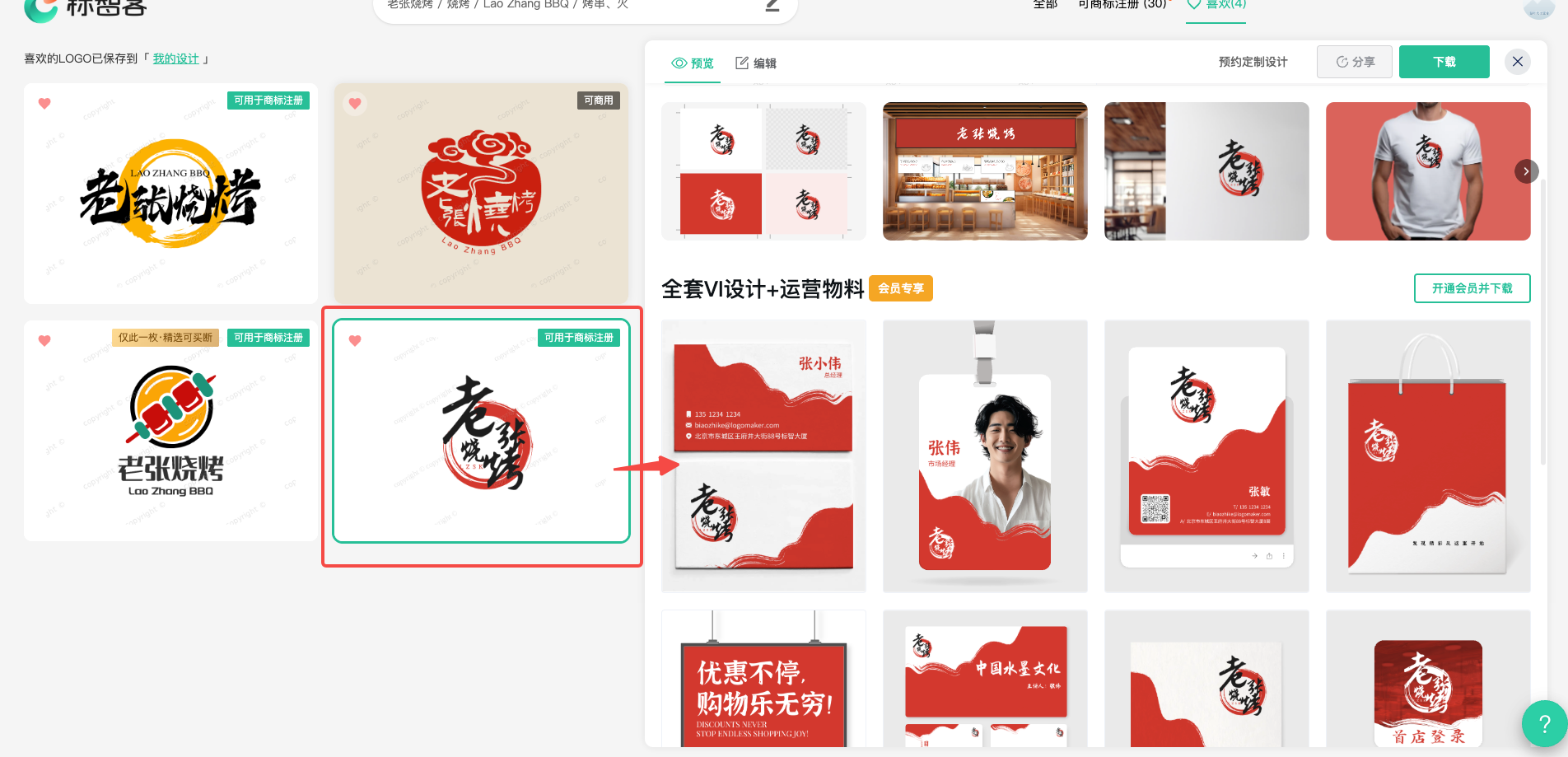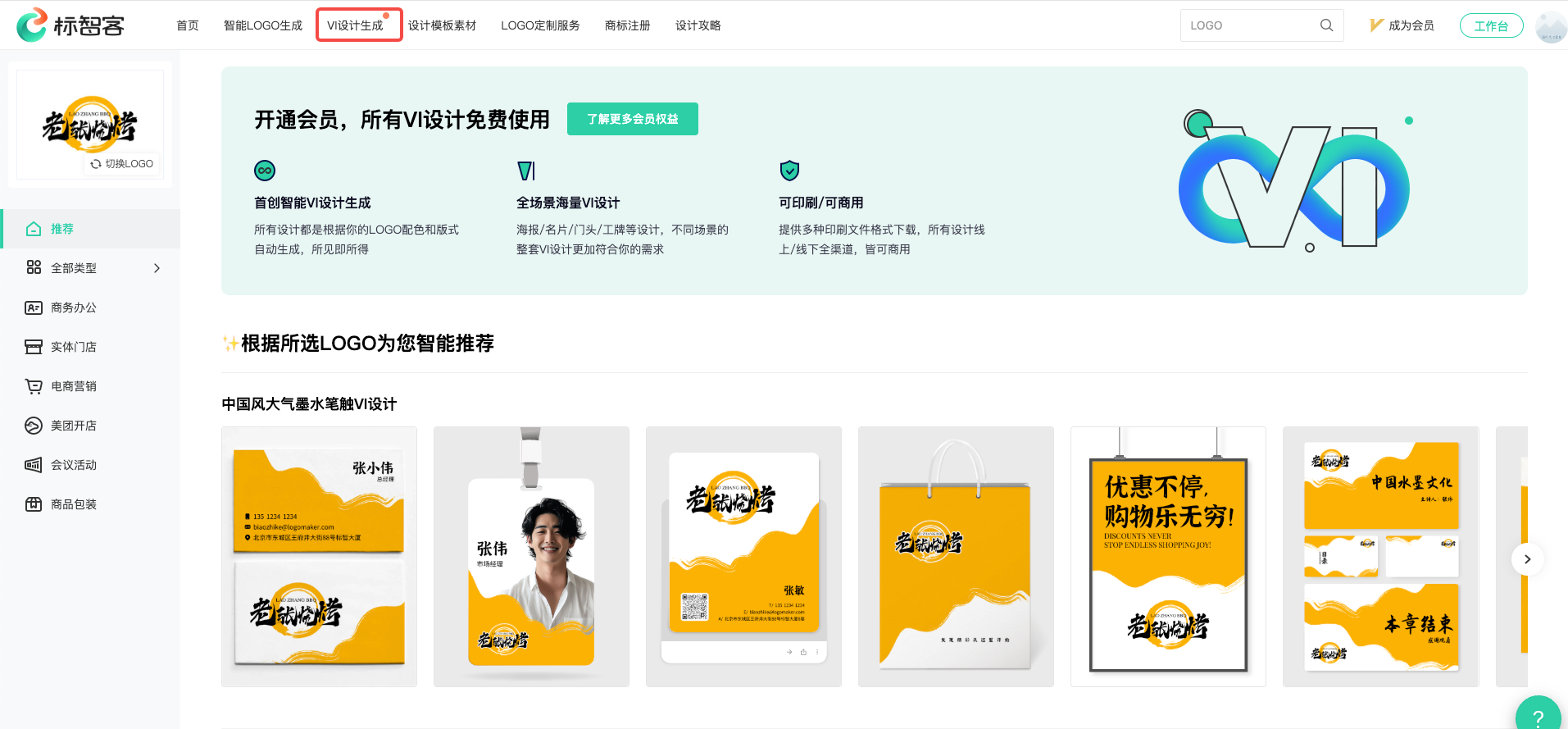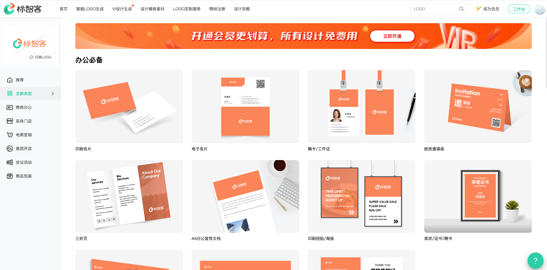 Logo有了,如果你还需要配套的海报、名片、招贴、宣传单等营销素材,标智客同时提供了配套的VI生成功能。当然,生成是免费的,下载就需要收费了。会员可以不限量随便下载,非会员可以单独付费下载。
