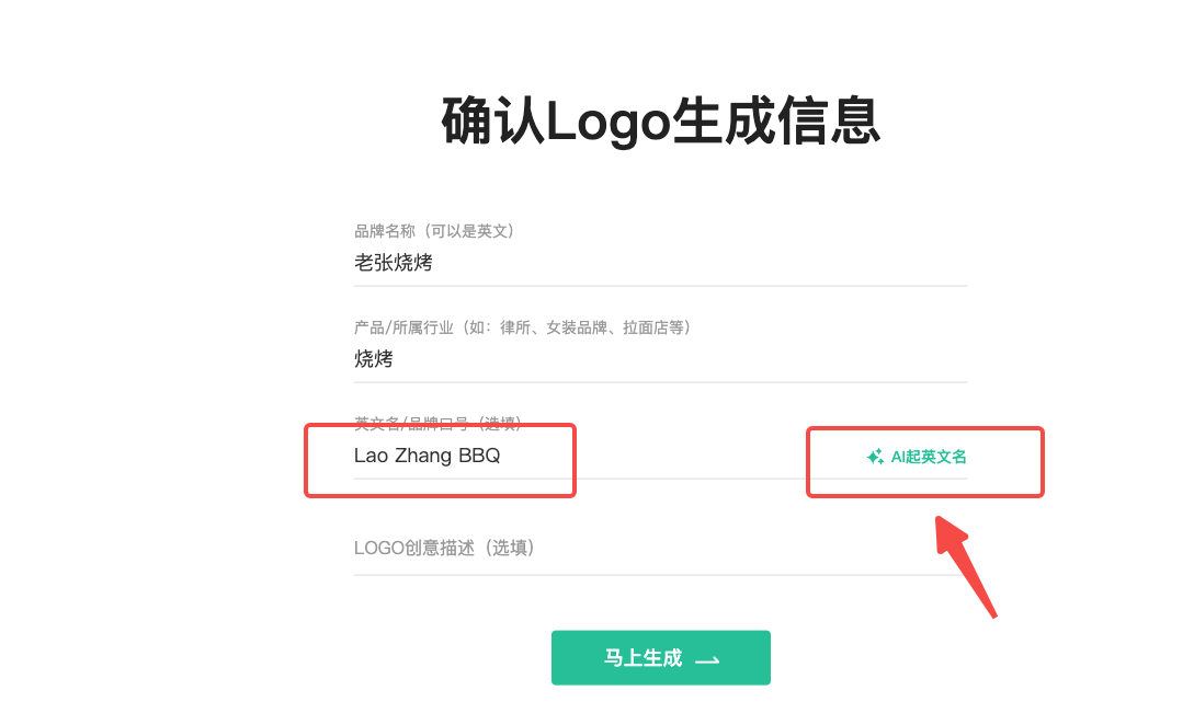 英文名或口号:自己不知道起什么就让AI帮你生成就好了,最下面的Logo创意空着就好了,当然如果你自己有设计思路就填上。如下图: