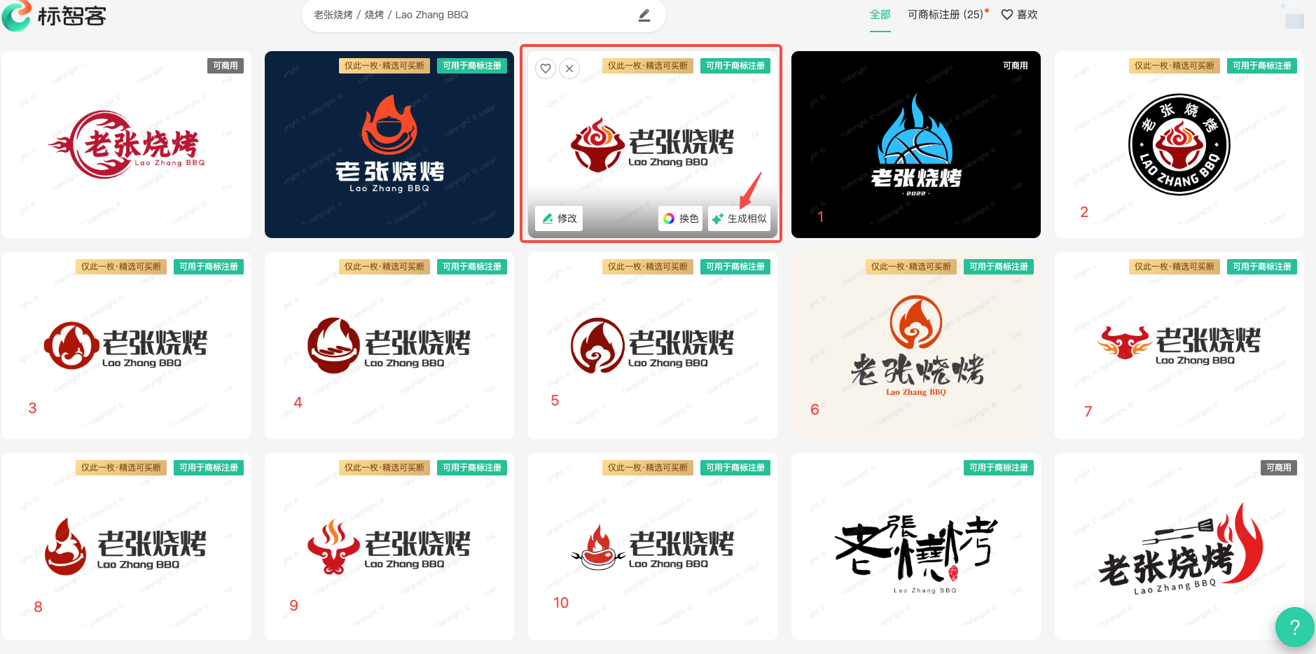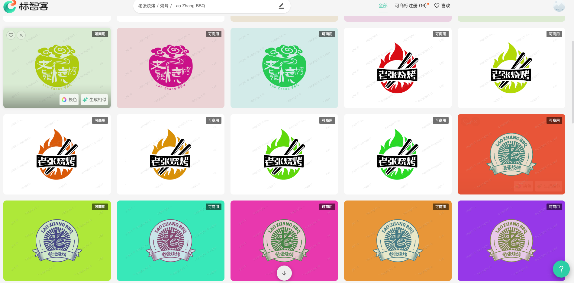 多样化生成方式:除了最基础的“自动生成”功能外,还提供了“生成相似”、“换色”和“按图形创意”等多种生成方式。“生成相似”可以在已有Logo基础上,生成风格相近但又有所不同的设计方案。“换色”功能允许用户快速改变Logo的颜色搭配,以满足不同的视觉需求。“按图形创意”则让用户可以输入特定的图形元素,如“烤串”、“火”等,使生成的Logo更贴合品牌特色。