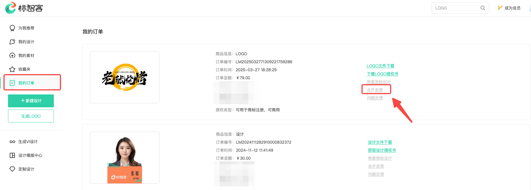 发开票的位置:工作台——我的订单——点击具体订单的“去开发票”链接,填写好发票抬头、税号和接收发票的email邮箱地址,过几天就会收到标智客发给你的电子发票。如下图: