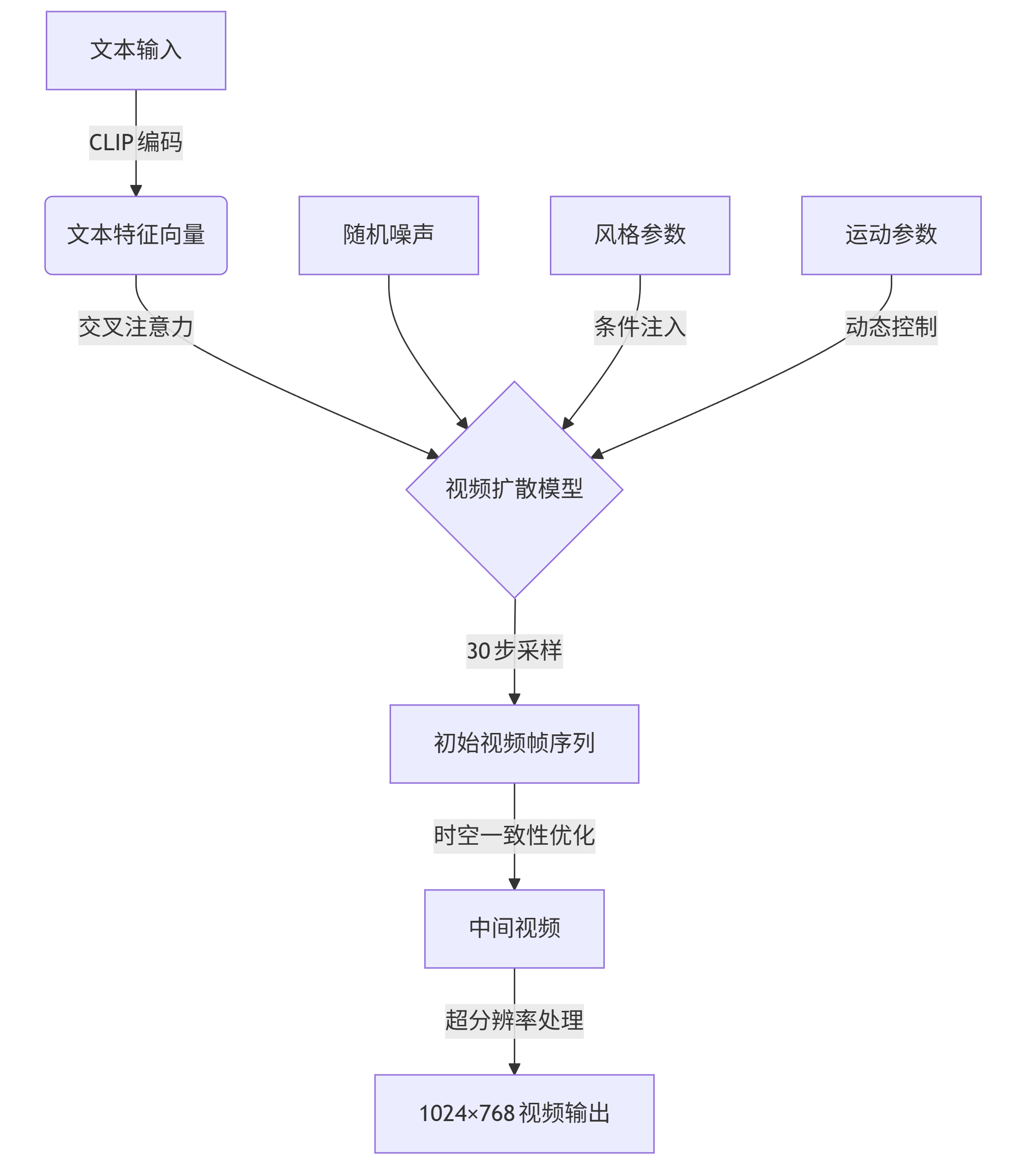 graph TD A[文本输入] -->|CLIP编码| B(文本特征向量) B -->|交叉注意力| C{视频扩散模型} D[随机噪声] --> C C -->|30步采样| E[初始视频帧序列] E -->|时空一致性优化| F[中间视频] F -->|超分辨率处理| G[1024×768视频输出] H[风格参数] -->|条件注入| C I[运动参数] -->|动态控制| C