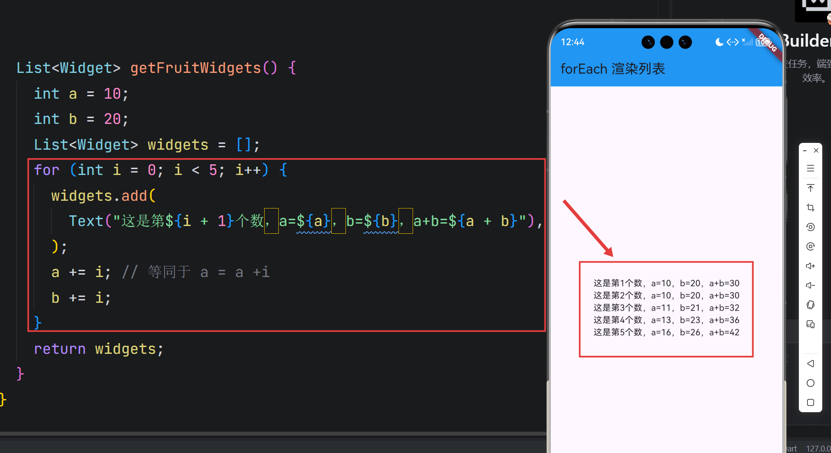 Text("这是第${i + 1}个数,a=${a},b=${b},a+b=${a + b}"),