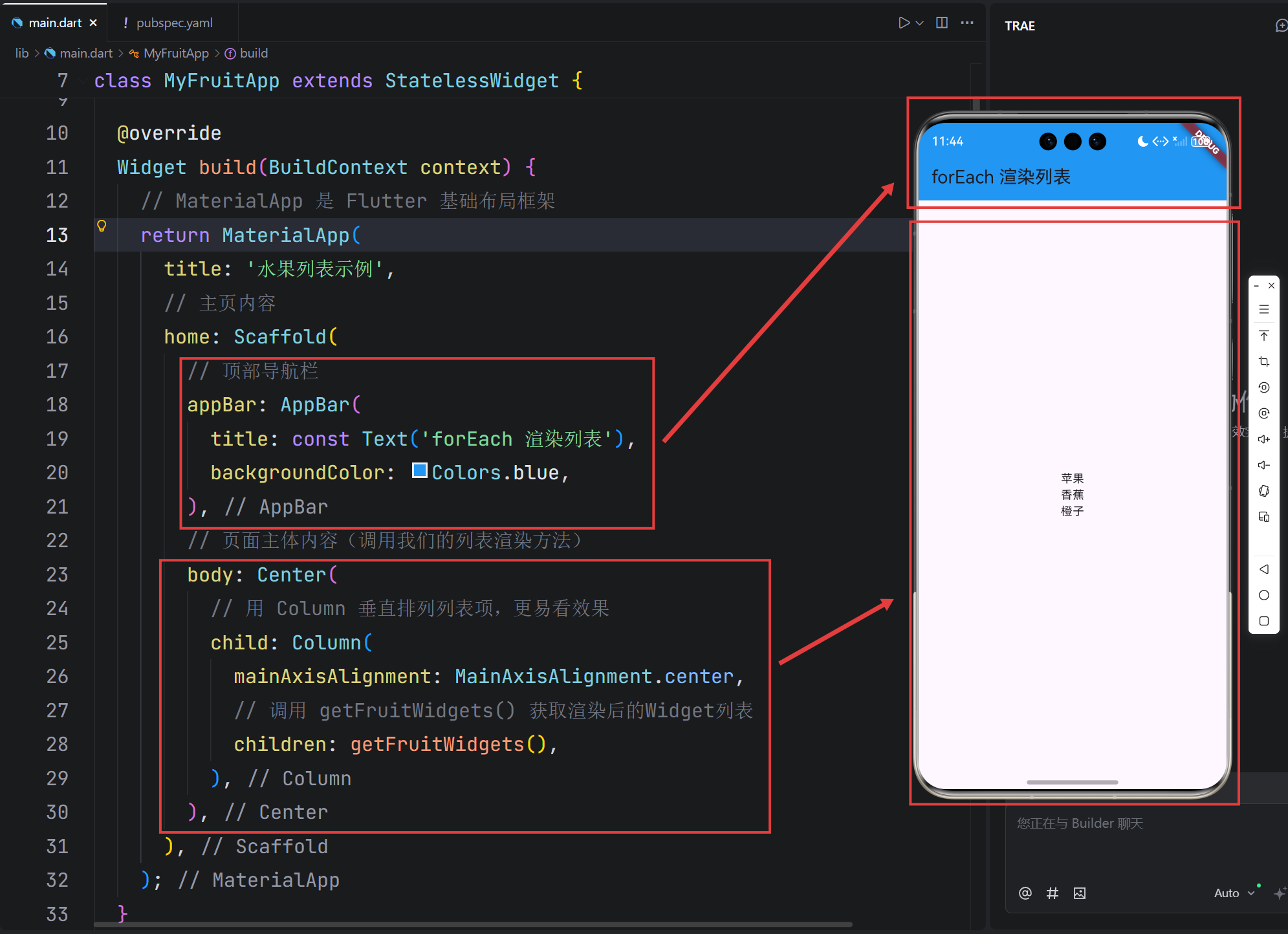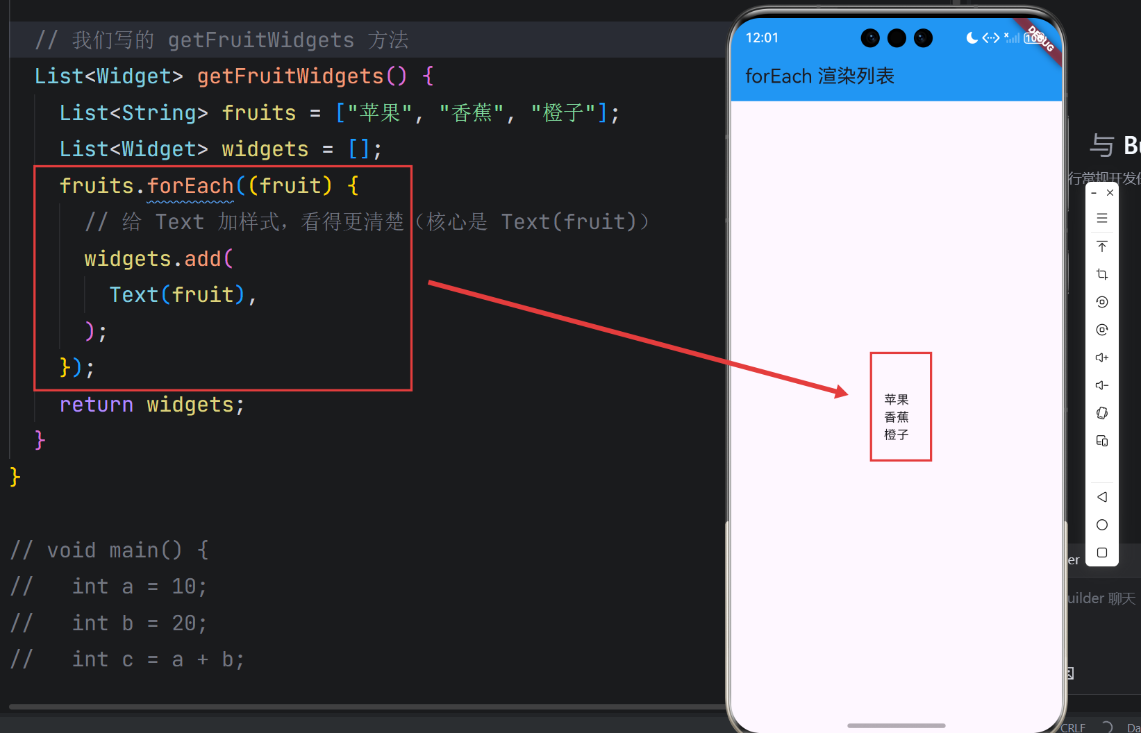 Flutter 关联:forEach 是 Flutter 中遍历列表渲染 Widget 的核心写法,比如: