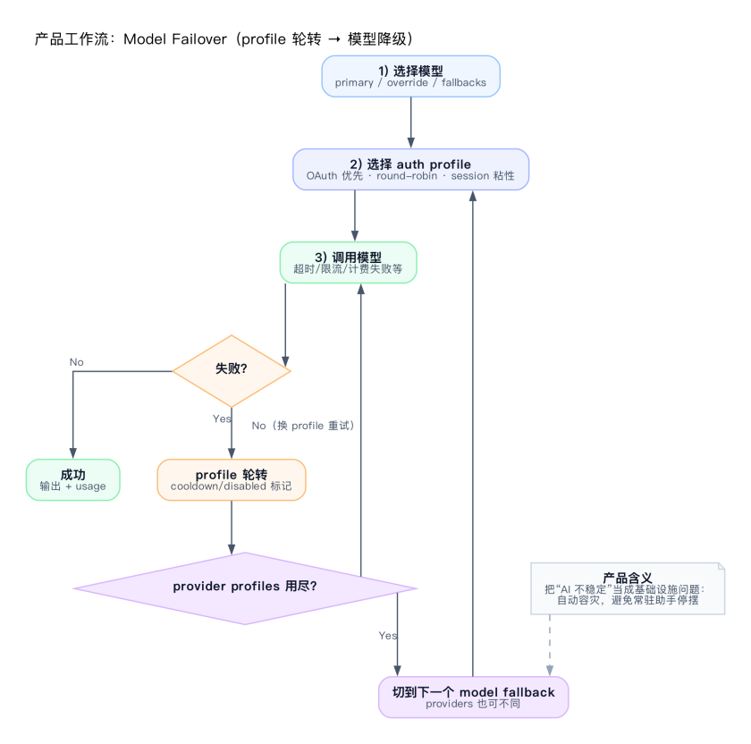- 第二层:模型降级——如果所有 profile 都挂了,切到 fallback 模型(比如从 GPT-4o 降到 Claude Sonnet,或者切本地模型)