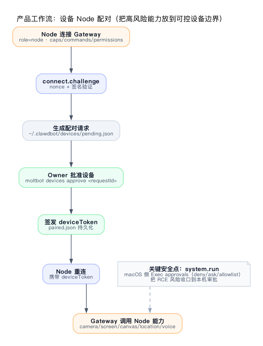 Moltbot 把摄像头、屏幕录制、Canvas 画布、语音、甚至执行系统命令这些能力外置到”设备节点”上: