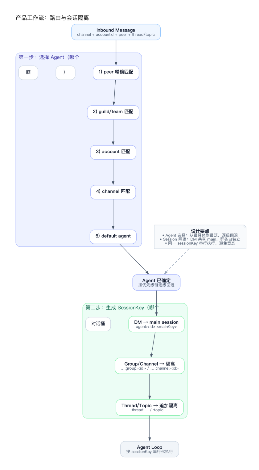 Agent 选择是一个优先级链:peer 精确匹配 → guild/team → account → channel → default。从最具体到最泛,逐级回退。