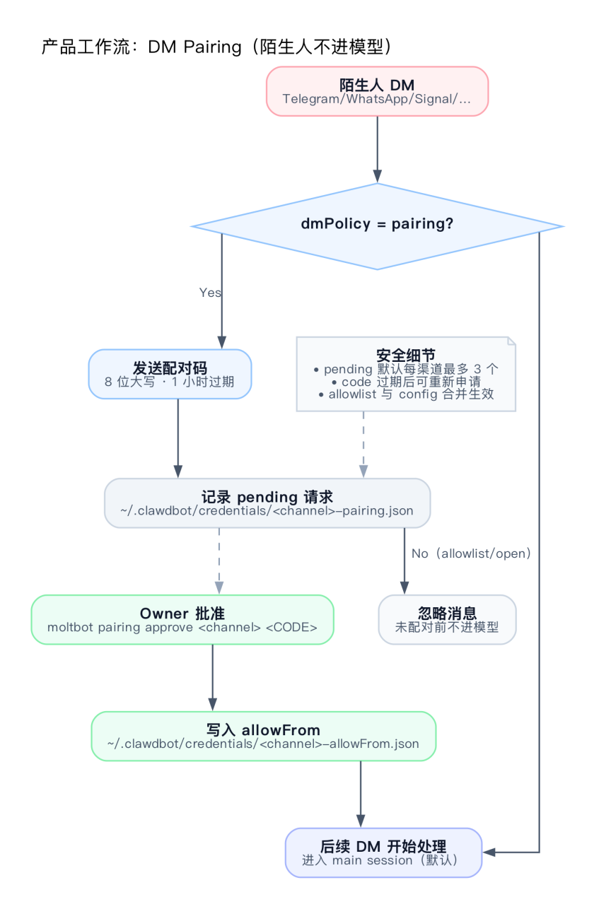 这是 Moltbot 安全模型里最直觉的一环:陌生人不进模型。