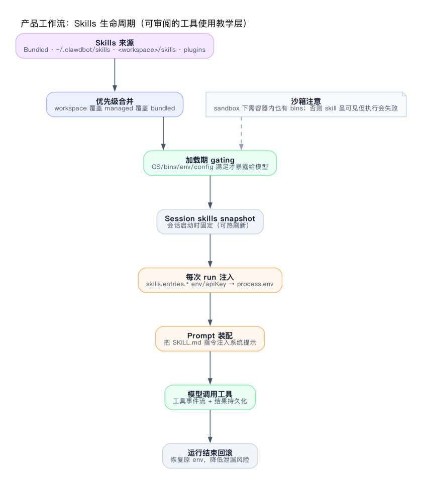 一个反直觉的事实:sandbox 下 skill 虽然”可见”(通过了 gating),但如果容器里没有对应的二进制,执行还是会失败。gating 只管”暴露”,sandbox 管”执行环境”。