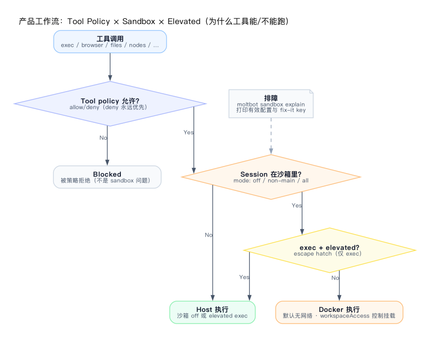 - Tool Policy(策略层):allow/deny 列表,deny 永远优先。被 deny 的工具直接 blocked,不走后面的逻辑
