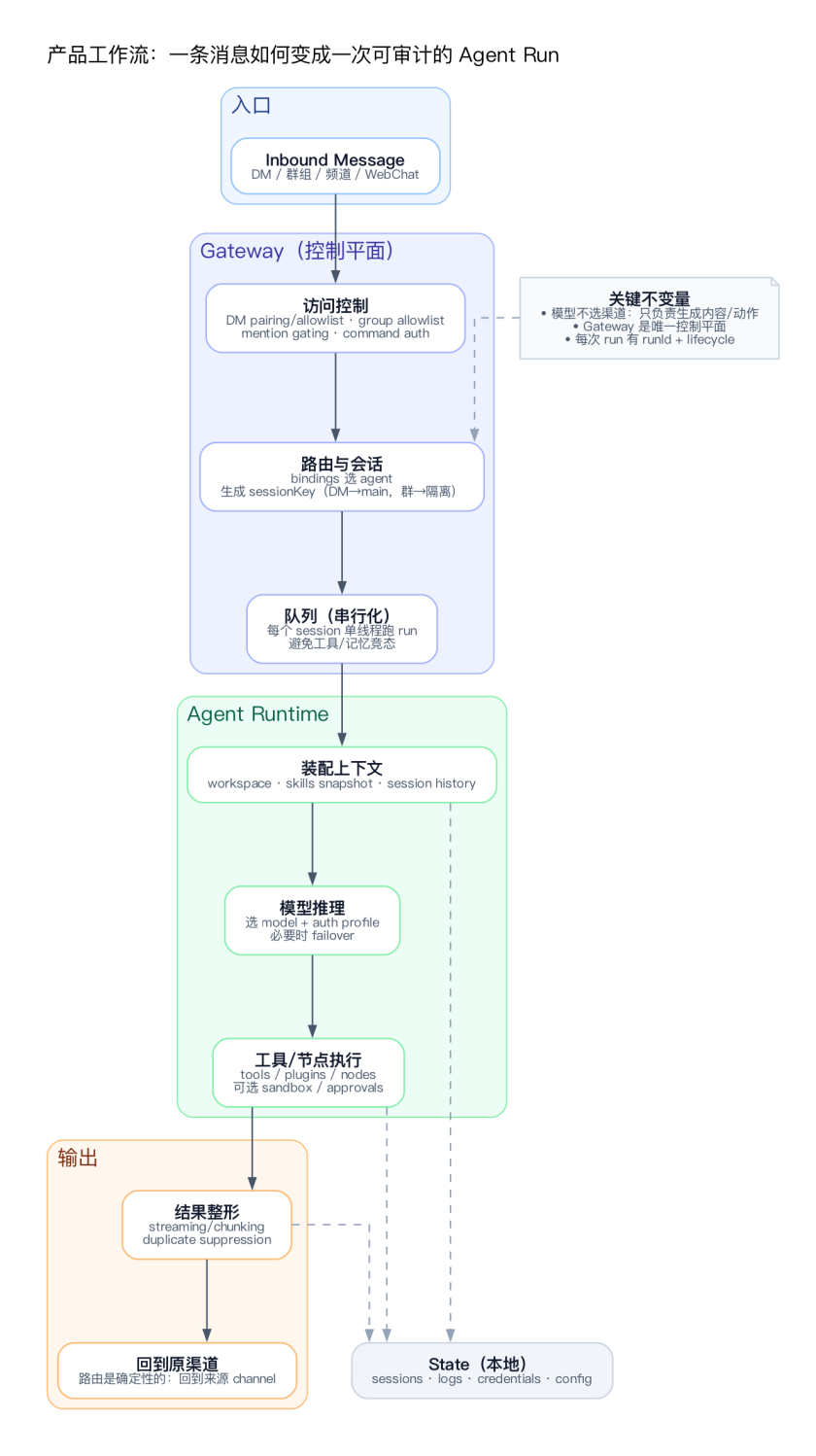 关键设计:模型不知道消息来自哪个渠道。它只负责”想”和”做”,Gateway 负责”谁能用”和”结果回哪”。