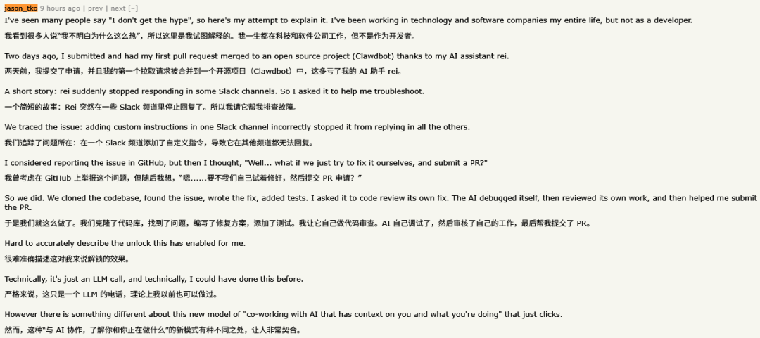 一位非开发者用户 @jason_tko 在 Hacker News 上分享了他的经历:他的 AI 助手在某些 Slack 频道停止响应,于是他让助手自己排查问题。