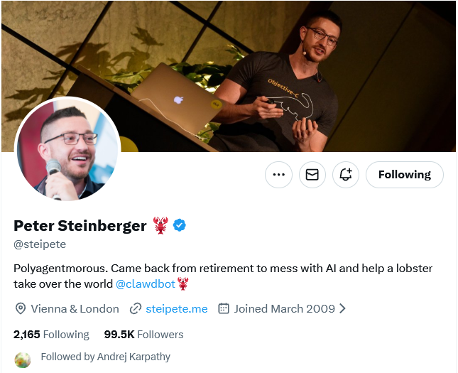 Clawdbot 的创造者是 Peter Steinberger (@steipete),一位在科技圈颇具传奇色彩的开发者。