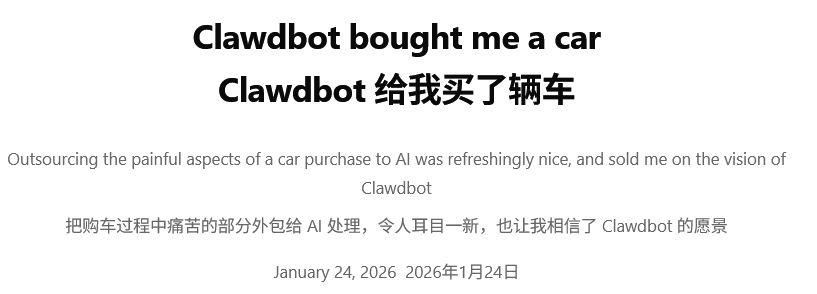 一个广为流传的案例来自 AJ Stuyvenberg,他用 Clawdbot 完成了购买一辆新车的繁琐过程。