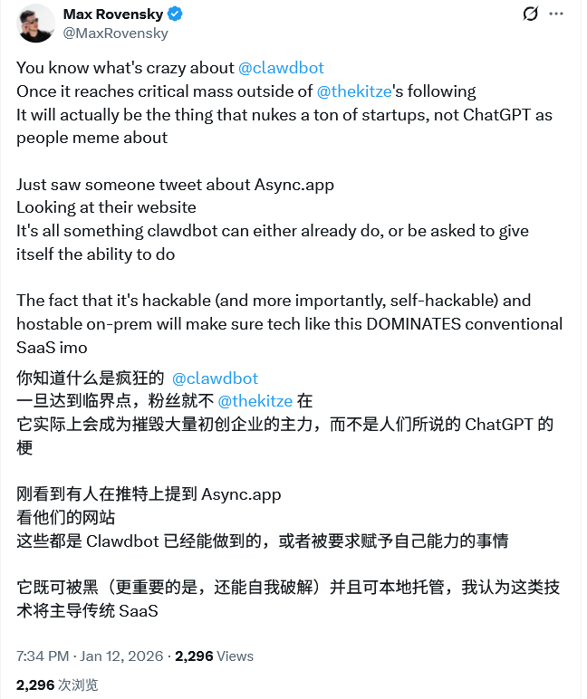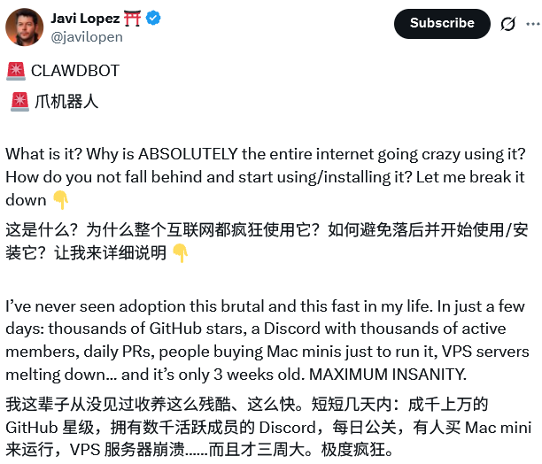 知名科技博主 Javi Lopez (@javilopen) 指出,Clawdbot 的爆发是因为它组合了人们多年来一直需要但未曾意识到的四样东西:永远在线、拥有持久记忆、能采取真实行动、并且开源。
