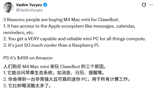 随着 Clawdbot 的流行,许多开发者和科技爱好者开始抢购 Mac mini,专门用来 7x24 小时运行他们的 AI 助手。科技博主 Vadim Yuryev (@VadimYuryev) 总结了三个原因: