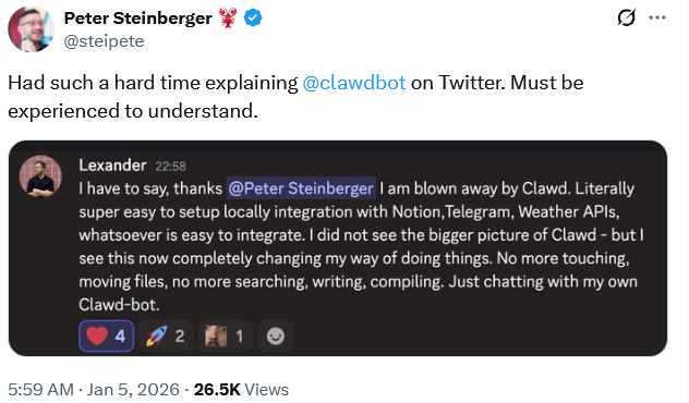 他在 X 上坦言:在 Twitter 上解释 @clawdbot 太难了。必须亲身体验才能理解。