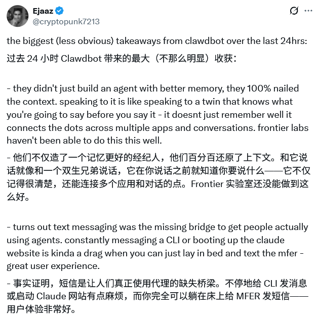 分析师 Ejaaz (@cryptopunk7213) 认为,Clawdbot 最大的启示之一是事实证明,短信是让人们真正使用代理的缺失的桥梁。