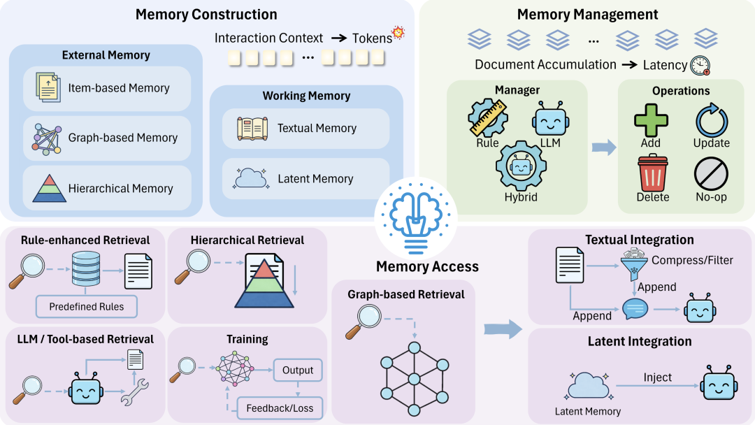 - 记忆访问:选什么 + 怎么用。访问分记忆选择与记忆整合,通过检索或训练等方式挑选记忆,再用压缩过滤或隐式注入减少 token 与重复编码。