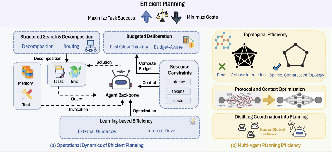 - 单智能体:少算但不掉效果。主要思路包括自适应预算与控制的 “选择性思考”、结构化搜索的剪枝与代价感知、任务分解的先规划后执行;以及通过策略优化与记忆 / 技能获取把高效规划 “内化或复用”,越用越省。