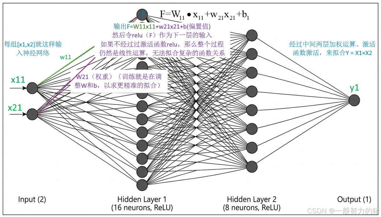 这是一个完整的PyTorch神经网络训练项目,用简单神经网络拟合,学习两个变量的乘积函数 Y = X1 * X2(输入X1和X2,让神经网络能通过训练学习到Y与X1、X2的对应关系)。通过这个项目以掌握神经网络训练的基本流程。本文的项目结构简单,只用了一个.py文件来呈现简单神经网络的训练过程,旨在快速看懂一个神经网络的训练过程(pytorch架构下)