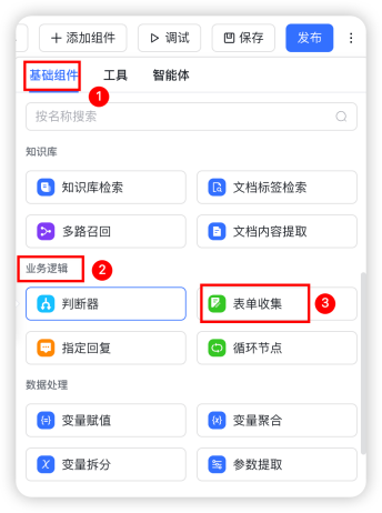 接下来要让智能体知道你的写作需求,所以得加个【表单收集】组件。点击页面右上角【添加组件】,找到【表单收集】。