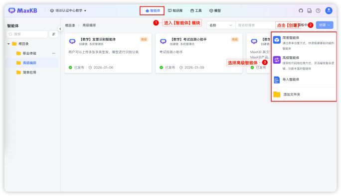 先登录 MaxKB 平台,找到【智能体】模块点进去。然后看页面右上角,有个【创建】按钮,点它!在弹出来的选项里选【高级智能体】,咱们的长文写作智能体就开始搭建啦~